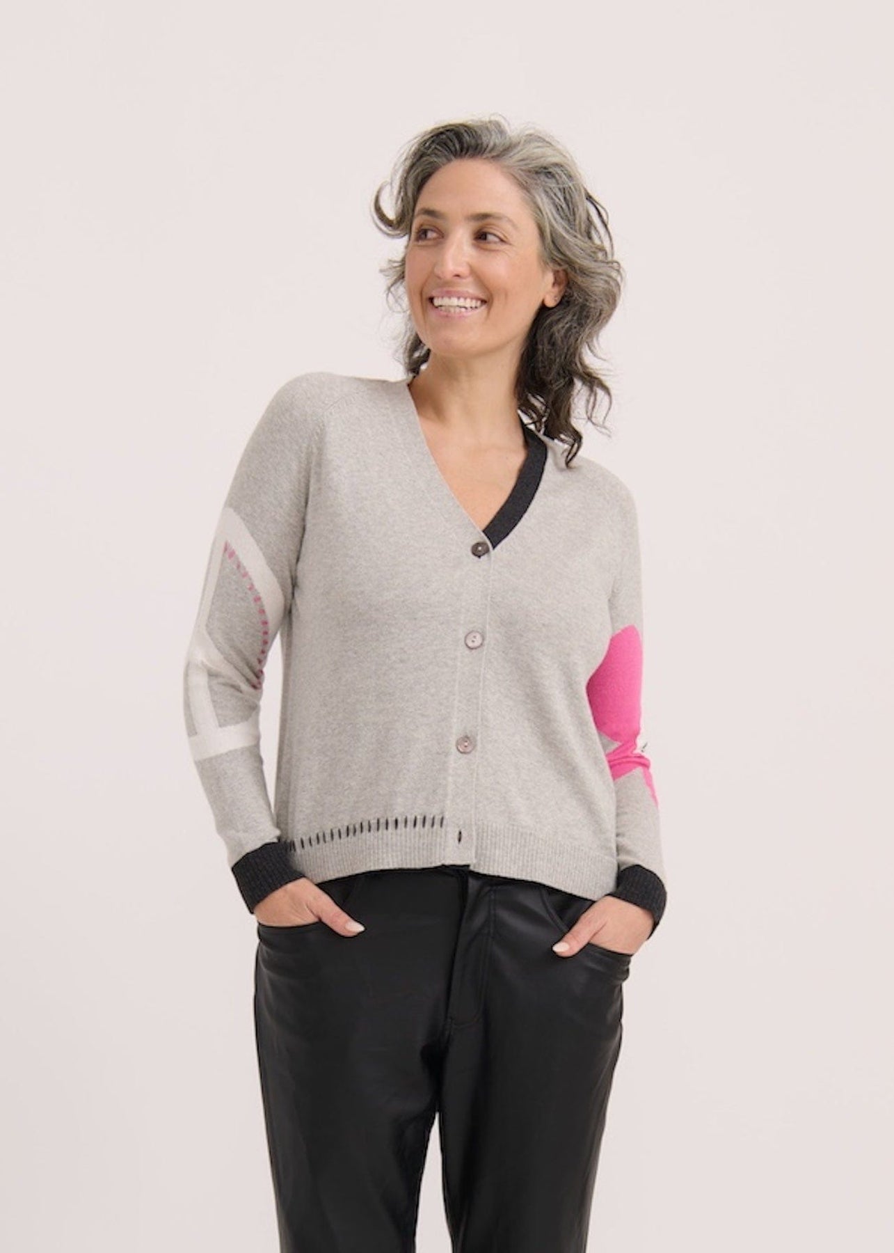 The Marl Peace Please Cardi by Zaket u0026amp; Plover reimagines the classic cardigan with its soft marl grey knit and relaxed silhouette. It features a flattering V-neck and button-front closure, enhanced by sleek black trim along the neckline, cuffs, and hem for a contemporary feel. With a bright pink flower on one sleeve and a white peace sign on the other, this cardigan is perfect for building cozy, stylish looks that stand out with personality.